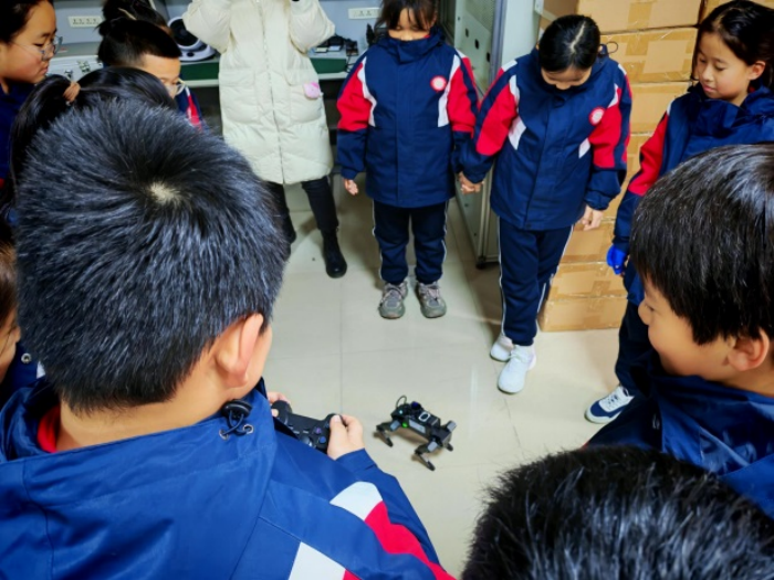 李晓慧老师团队向同学们介绍机器狗的工作原理,演示机器狗的跑动、转身等动作,向大家科普物联网与数据交互的基本概念,讲解机器狗如何通过接收指令、处理数据完成动作,让抽象的技术概念变得生动可感。同学们纷纷表示,物联网的世界让万物相连,让机器拥有智慧!